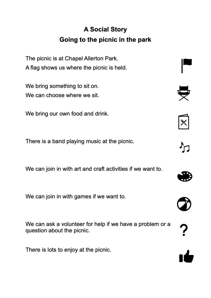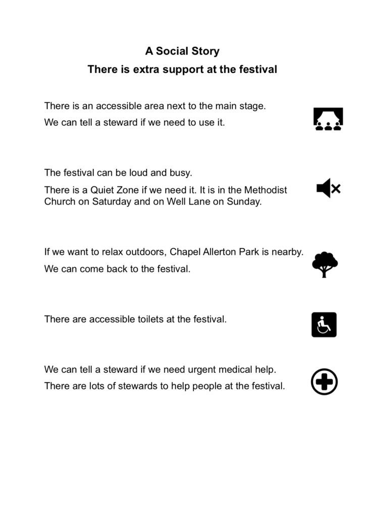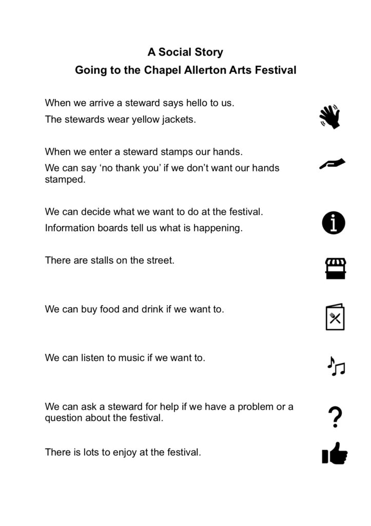 Social stories are short, descriptive accounts to help people, particularly those with learning disability and/or neurodiversity, understand and manage a specific situation. There are three social stories about the festival, each with a symbol and photo version, they are: Going to the Chapel Allerton Arts Festival; There is extra support at the festival; and Going to the picnic in the park. Please view them on the website here, they can be printed at home.